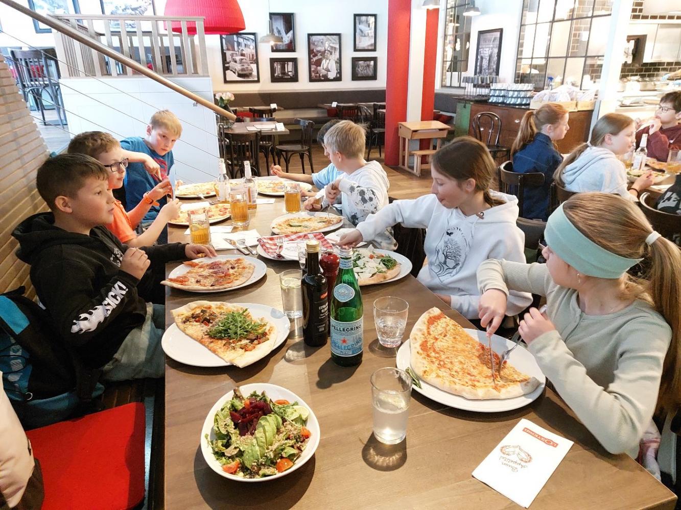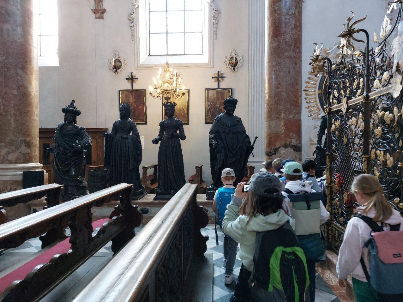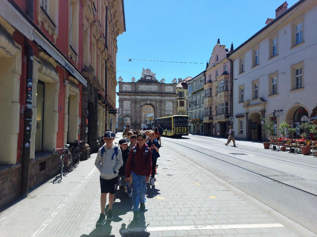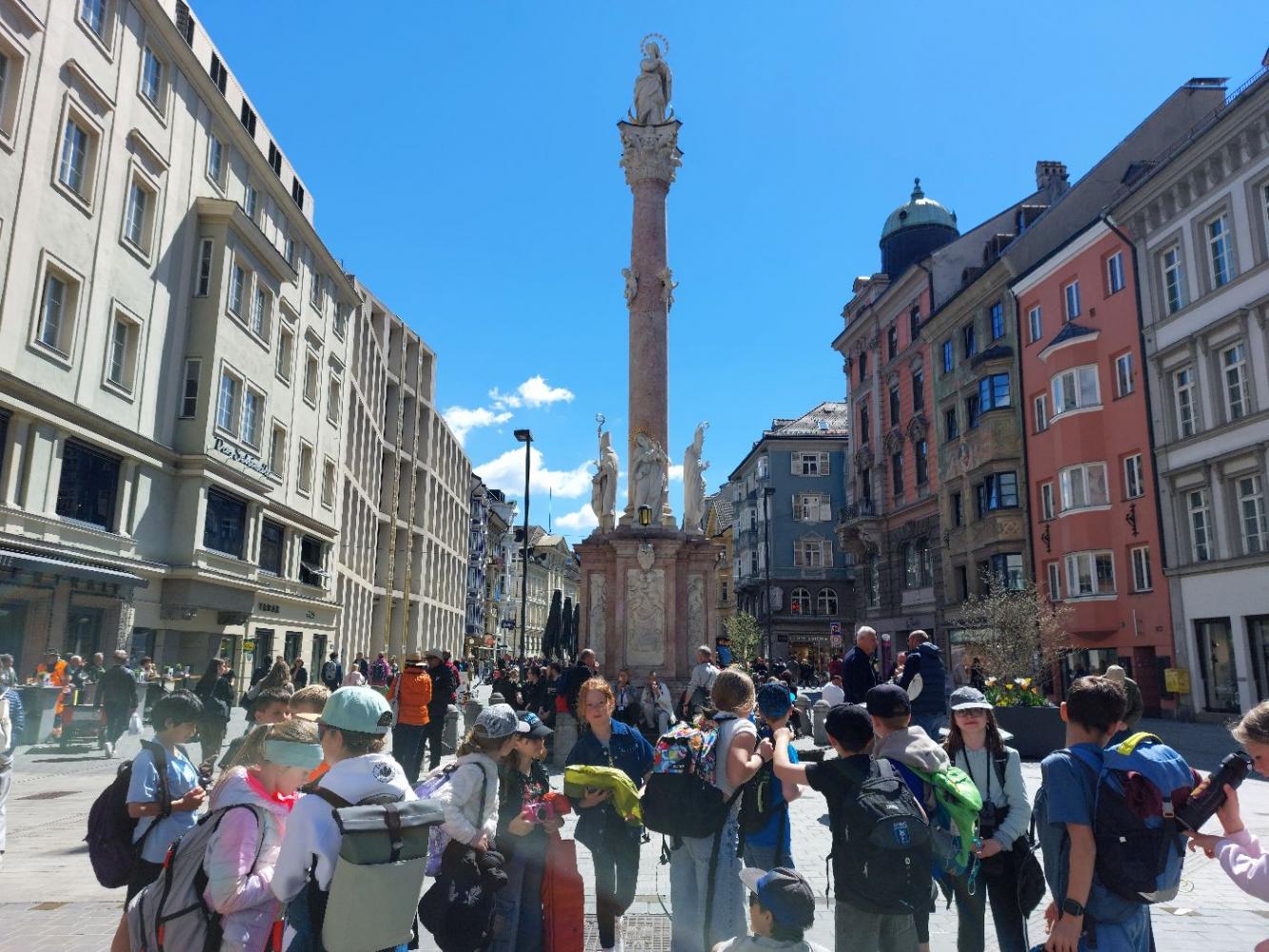 Anschließend ging es mit der Straßenbahn weiter in die berühmte Maria-Theresien-Straße, das Herz der Innsbrucker Innenstadt. Zum Mittagessen konnten sich alle in der L`Osteria bei einer leckeren Pizza stärken. Am Nachmittag stand ein Stadtrundgang auf dem Programm. Dabei wurden die wichtigsten Sehenswürdigkeiten Innsbrucks erkundet. Besonders beeindruckend war der Besuch der Hofkirche, wo die Kinder bei einer Audio-Führung vieles über Kaiser Maximilian I. erfuhren.